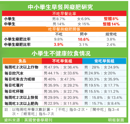 不吃早餐小學生癡肥高1.6倍 【明報專訊】早餐為一日之始提供能量,但中大一項涉及逾1.1萬名學生的大型研究卻發現,多達8%小學生每周只吃2次甚至完全不吃早餐,反而日日食薯片、杯麵、朱古力和飲汽水。每10名不吃早餐學童之中有1人癡肥,癡肥比率較常吃早餐學童高出1.6倍。處發育期的中學生則多達14%無吃早餐習慣,問題令人關注。 為了解本港中小學生不吃早餐習慣與肥胖關係,中大醫學院兒科學系為全港18區共36間中小學的3644名小四至小六學童,以及7926名中一至中七學生進行調查,發現多達16.8%小學生超重,4.5%屬癡肥,其中男學童超重和癡肥比率更分別高達21.5%和6.2%;表示在過去一周內吃早餐次數只有2次或以下者共有8%,其中半數更是天天也不吃早餐;表示每天均吃早餐的學童則有73%。 中學生方面,13.9%屬超重或癡肥,其中男生超重或癡肥比率達17.4%,約14%一周吃早餐2次或以下,當中5.6%完全不吃早餐,只有半數中學生每天均吃早餐。 研究顯示,不吃早餐的學生日常飲食較多「垃圾食物」,其中以小學生尤其顯著,約48%男生和36.4%女生每周至少吃兩次煎炸食品;44%男生和35%女生天天飲汽水;36%男生和22至28%女生每日吃薯片和杯麵(見表)。 另外,不吃早餐與癡肥亦有顯著關係,其中不吃或間中吃早餐的小學生,分別有9.8%和10.6%屬癡肥。每周吃多一餐早餐的男生,其體重指標(BMI)就低0.125,女生更低0.165,身體脂肪比率則分別可減0.219%和0.353%。 無早餐填肚 多吃垃圾食物 帶領是項研究的中大兒科學系教授倪以信和其研究隊伍在研究報告指出,學生未能透過早餐攝取營養和能量,是令他們吃更多高熱量的垃圾食品填肚的原因之一;不注重早餐的學生,整體健康飲食的意識亦較弱,故可解釋為何他們較多進食垃圾食品。 對於部分家長會因為子女肥胖,而「支持」他們不吃早餐以達到減少進食的目的,研究人員反指,相對起午膳,家長為子女安排具營養的早餐其實更有「控制權」,有助提升子女膳食質素。有關研究在最近一期《英國營養學期刊》發表。