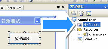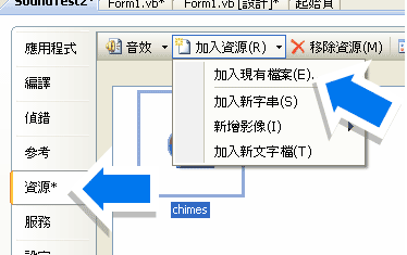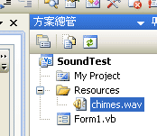 • 按右圖,匯入的資源名為 My.Resources.chimes(省略副檔名)