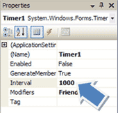 • Interval:訂定Timer每次執行Tick(...)前所等待的時間。計算單位為千分之一秒;若要Timer每秒執行Tick(...)一次,Interval需改為1000。